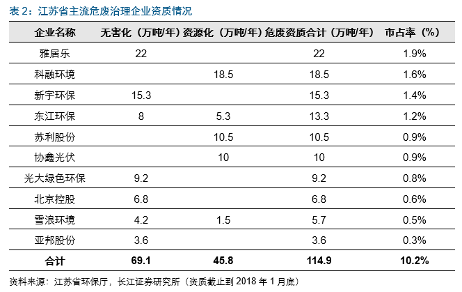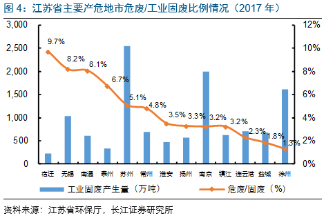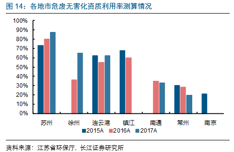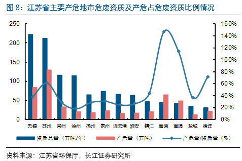 徐州(18%)/连云港(25%)/淮安(27%)/扬州(29%)/常州(29%)占比较低,危废资质供给量相对充裕;