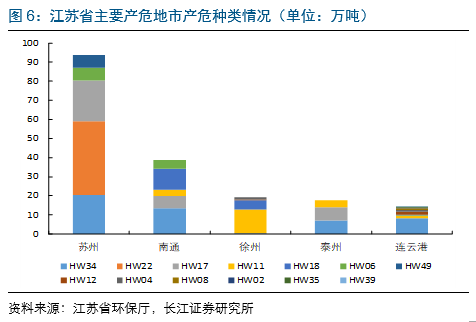 化工行业是产生废酸,精馏残渣最多的行业,江苏作为我国化工大省,几乎每个地市都会有大量的废酸产生,例如苏州、南通、泰州、连云港等。另外,南通、连云港、扬州农药生产企业较多,产生较多的农药废物(HW04)。