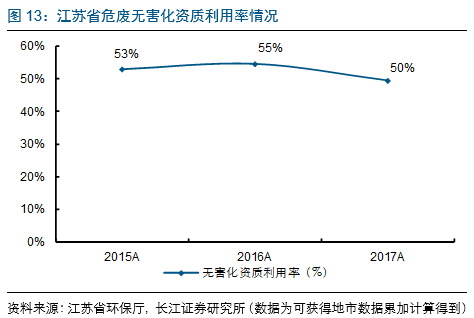 根据部分样本我们统计得出2015-2017年江苏省无害化危废资质利用率分别为53%、55%、50%。从样本来看,苏州无害化(焚烧+填埋)资质利用率一直很高,保持在70%以上,2017年达到87%。