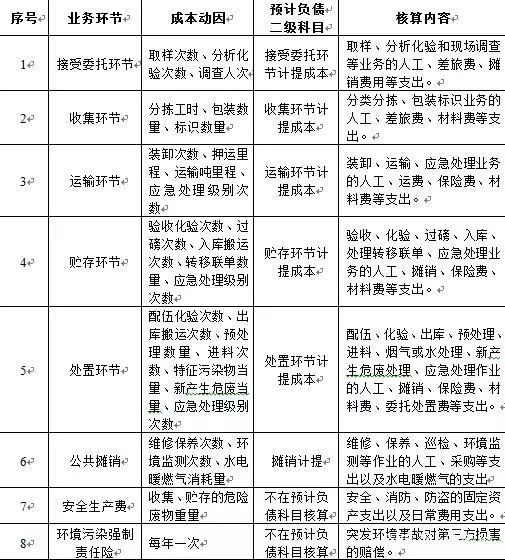 对于收集环节的风险和成本,构成服务的必要部分,依据《国家危险废物名录》、《危险废物贮存标准》、危险废物包装要求等,建议采用作业成本法测算和制定分类分拣作业、包装标识作业的成本计提标准。