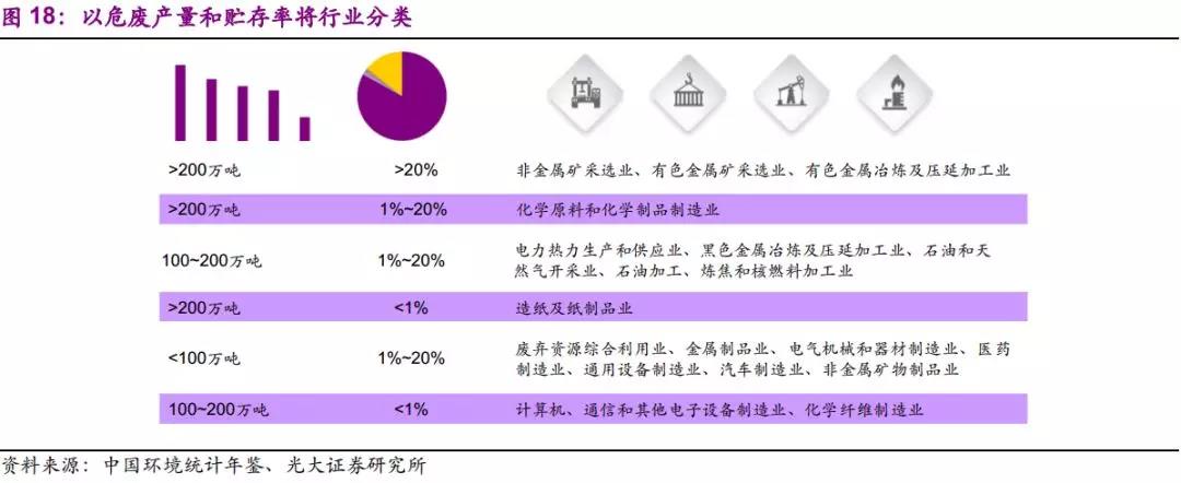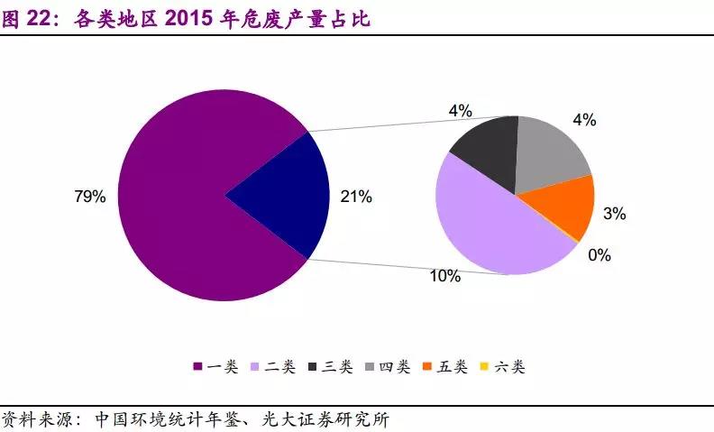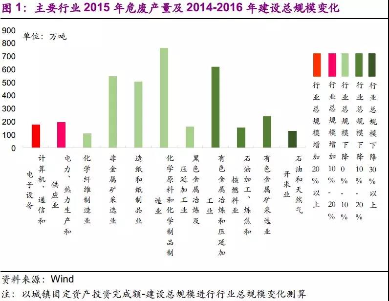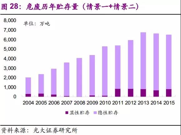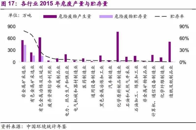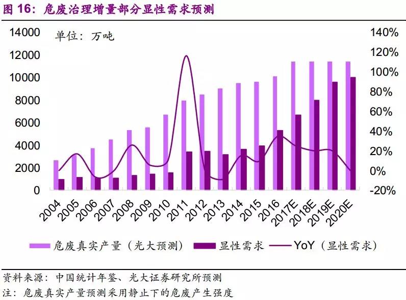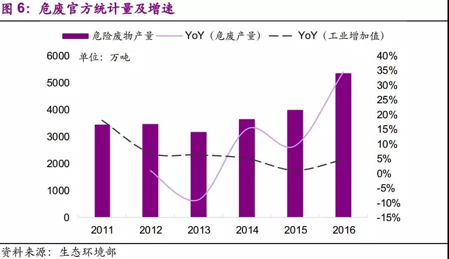 (2)环保压力提升,官方统计量已逐渐弥补先前统计不足的问题。2013年两高司法解释后,官方统计量增速不断提高,2016年增速34%,远高于同期工业增加值增速5%。考虑到对危废申报登记制度执行情况的核查已纳入危险废物规范化管理指标体系,我们认为应重视官方统计量的意义:反映环保力量所触及之处的显性需求。随着环保执法逐渐深化,隐性需求不断转化为显性需求,官方统计量将更好地体现危废的产生量,并接近真实产生量。