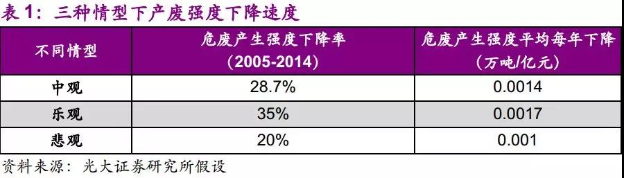 事实上,随着技术和工艺进步和工业结构变化,单位工业增加值固体废物产生强度呈逐年下降趋势。我们分为乐观、中观、悲观三种假设预期,对危废产生强度下降速度对危废产量的影响进行预测:假设中观情况下,危废产生强度跟随固废产生强度,即2014年比2005年下降28.7%。