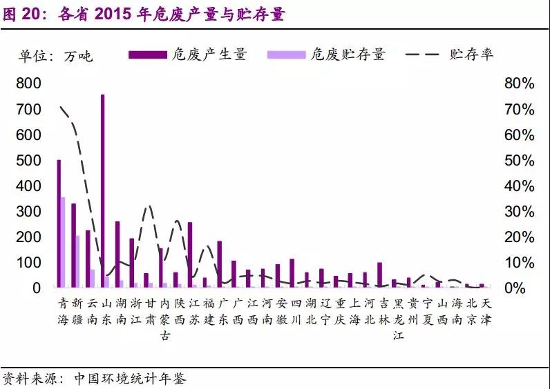 2015年,山东、青海、新疆、湖南、江苏、云南六省危废产量在200万吨以上,青海、新疆、甘肃、云南、陕西五省贮存率高于全国均值20%。