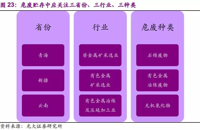 综上,危废贮存量应关注的省份:青海、新疆、云南;应关注的行业:非金属矿采选业、有色金属矿采选业、有色金属冶炼及压延加工业;应关注的危废种类:石棉废物、无机氰化物、有色金属冶炼废物等。