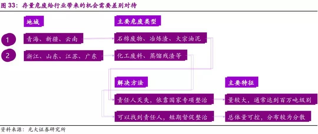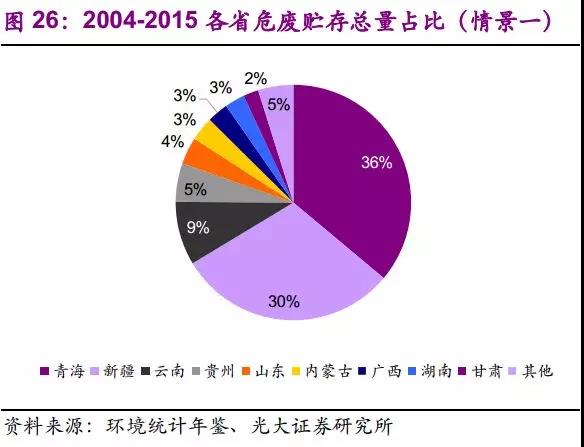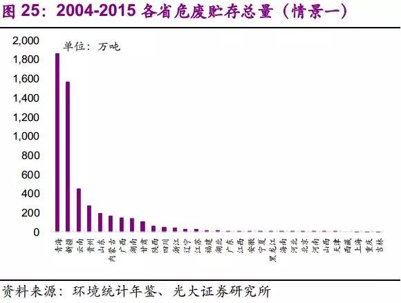 ◆存量部分:自上而下,历史累积、自然消减和官方统计量差别三因素模型:假设年消减系数γ为0.7、0.8、0.9,则2004-2015年累计贮存总量分别为6847.9、13584.4、27201.3万吨。应关注的省份:青海、新疆、云南;应关注的行业:非金属矿采选业、有色金属矿采选业、有色金属冶炼及压延加工业;应关注的危废种类:石棉废物、无机氰化物、有色金属冶炼废物等。自下而上,环保督察角度:危废存量在“环保督察”中已大量暴露:在新疆、青海、云南等地,发现数百万吨的石棉、冶炼废渣以及油泥,验证了我们前文提到的需关注行业和省份。