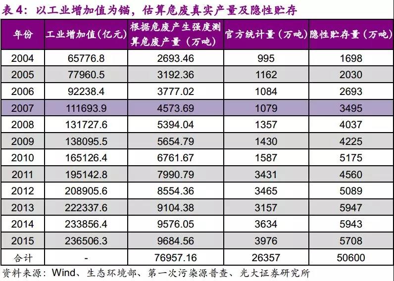 由于2007年第一次污染源普查中公布的危废产量与当年官方统计量存在差距,人们普遍认为官方统计量与实际产量之间存在较大差距。原因在于当前危废自主申报制度下,环保压力覆盖面不足,导致大量企业瞒报漏报。假设未纳入官方统计的危废产量全部未经处置自然堆存。同时以2007年污染源普查时期危废产量为真实值,以工业增加值/危废产量为比例系数,估算其他年份危废真实产量,从而得出危废隐性贮存量。