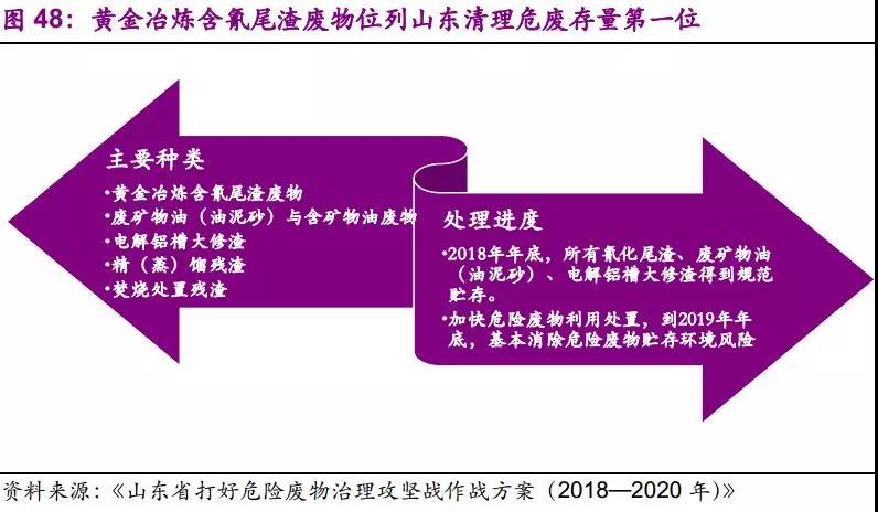 无机氰化物存量清理已拉开序幕,利好危废焚烧企业及水泥窑协同处置企业。2018年8月8日,山东省人民政府印发《山东省打好危险废物治理攻坚战作战方案(2018—2020年)》,提出加快清理危险废物存量。针对黄金冶炼含氰尾渣废物、废矿物油(油泥砂)与含矿物油废物、电解铝槽大修渣、精(蒸)馏残渣、焚烧处置残渣等长期大量贮存的危险废物,建立管理台账,督促各市加快清理进度。在山东省存量危废中,黄金冶炼含氰尾渣废物和废矿物油(油泥砂)与含矿物油废物分别居第一、二位。