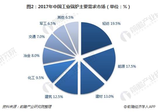 在我国工业生产中需要大量用热的行业,主要是轻纺行业能源行业。其用热温区和用量比例,和美国1977年对全国工业用热的调查估计大体一致,工业用热的参数范围大约在300℃和1.0MPa以下。工业锅炉应用结构中,轻纺工业约占19.5%,年需求量约5.25-5.85万蒸吨/时;能源余化工业约占27%,年需求量约7.29-8.1万蒸吨/时;建材工业以水泥为主,约占13.0%;年需求量约为3.51-3.9万蒸吨/时。由于行业热能应用短期内不会出现替代品,未来轻纺工业、能源工业、建材、建筑业、化学工业、冶金工业、交通运输业和军工部门等仍将是工业锅炉的主要市场。