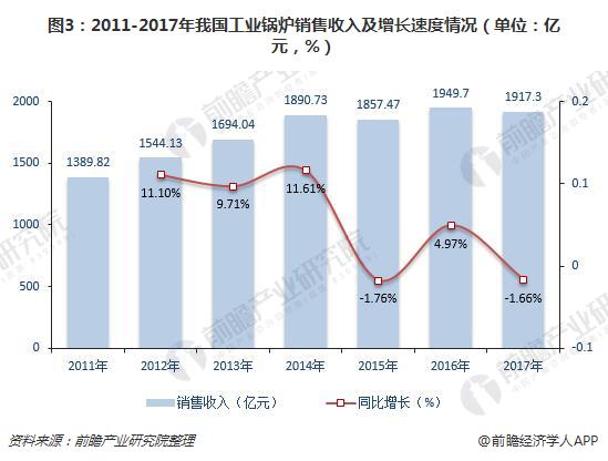 从行业的销售收入来看,2011-2017年我国工业锅炉行业销售收入呈波动态势。2015年出现自2011年起的首次下滑,销售收入为1857.47亿元,较上年减少1.76%;2017年行业销售收入再次出现下滑,为1917.3亿元,下滑幅度位1.66%。这与能源政策和节能、环保要求的制约有着较大的关系。