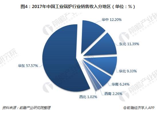 不同的地区对工业锅炉的用途大多不一样,比如东北地区,工业锅炉多用于生产冬季采暖,而南方区域则主要应用于工业生产动力的供应。整体而言,我国工业锅炉行业在华东市场发展较好,占据着过半的市场份额。2017年,华东区域销售收入占全国销售收入的比重为57.57%;其次是华中地区,占比为12.20%;东北和华北占比分别为11.39%、9.33%;华南、西南以及西北占比分别为6.24%、2.26%、1.02%。