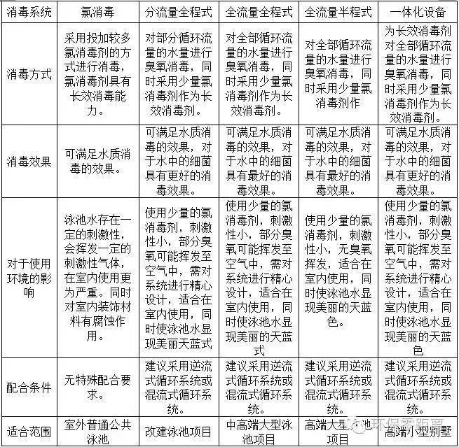 游泳池水处理系统的一个重要组成部分是消毒系统,常用的消毒系统有氯消毒系统、臭氧消毒系统等。其中臭氧消毒系统从消毒量来分有全流量臭氧消毒系统和分流量臭氧消毒系统两大系列;从消毒流程来分有全程式及半程式两种;同时,为了适应新的发展,目前出现了一种一体化臭氧消毒设备。这些消毒系统的特点具体见下表: