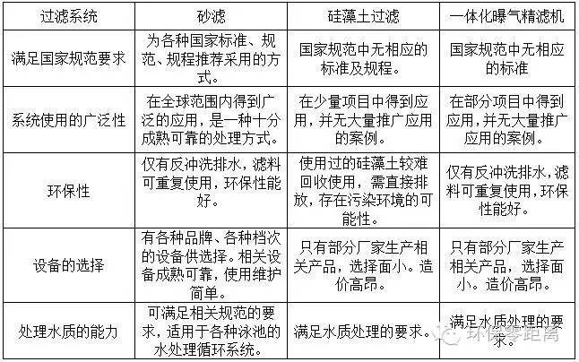 泳池过滤系统为循环处理系统的重要组成部分,该系统的选择直接影响着游泳池水处理系统是否满足使用要求。现在的过滤系统有砂滤、硅藻土过滤、一体化曝气精滤机等,他们各有特点,具体的分析见下表。
