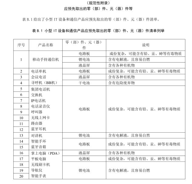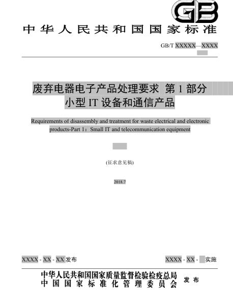 回收利用分委会公布了《〈废弃电器电子产品处理要求第1部分:小型IT设备和通信产品〉国家标准(征求意见稿)》、《〈废弃电器电子产品处理要求第1部分:小型IT设备和通信产品〉国家标准编制说明》两个文件,以下分别简称《征求意见稿》和《编制说明》。两个文件分别发布于今年7月和8月,征求意见将于本月底结束。