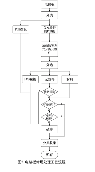 电路板的处理可采用破碎、分选、火法或湿法冶金等技术,电路板常用处理工艺流程如图所示。