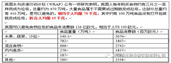 英国家庭每年产生670万吨食品垃圾,相当于购买量的三分之一(年食品购买量2170万吨),大部分食品垃圾得到及时收集,约590万吨,占88%,其中只有一小部分得到回收利用,大部分进入生活垃圾填埋场。剩余80万吨通常的去向是家庭堆肥,动物饲料和粉碎排掉。