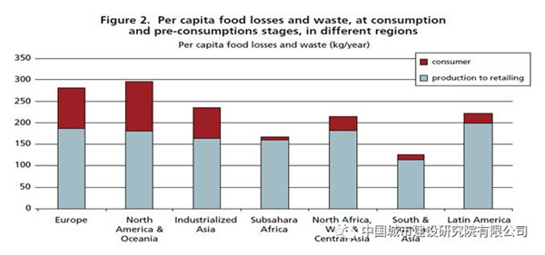 按人均计算,发达国家和地区人均食物废弃量较高。欧洲与北美人均可食用的食物生产量900千克/年,损耗和废弃量分别是280-300千克/年,其中废弃量达到95-115千克/年,而非洲、南亚及东南亚低收入地区产量只有460千克/年,损耗和废弃量分别是120-170千克/年,其中废弃量只有6-11千克/年。