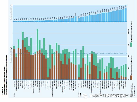 德国不同地区人均单独收集的有机垃圾量差别很大。这是德国北威州2015年的有机垃圾人均分类收集量统计。最右边的人口密度高的地区是所谓的城市,城市人口密度最高也就是每平方千米2000多人,比我们低多了,因此,单独收集的有机垃圾主要是园林垃圾(绿色部分),而厨余垃圾收集量较少(红色部分),而相应的农村地区,单独收集的有机垃圾主要是厨余垃圾,园林垃圾占比反而低。实际上,德国农村以及小城镇地区,园林绿化面积更多,相应园林垃圾产生量会更多,但是这部分园林垃圾并没有纳入统计,这也反映了生活垃圾统计口径问题。德国厨余垃圾分类收集的实际数据对国内开展垃圾分类有很好的借鉴意义。