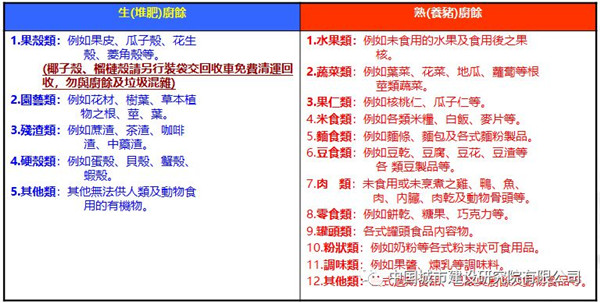台北市自2003年12月26日开始全面回收家庭厨余,家庭厨余分类为“养猪厨馀”及“堆肥厨馀”,详细分类如上表所示。