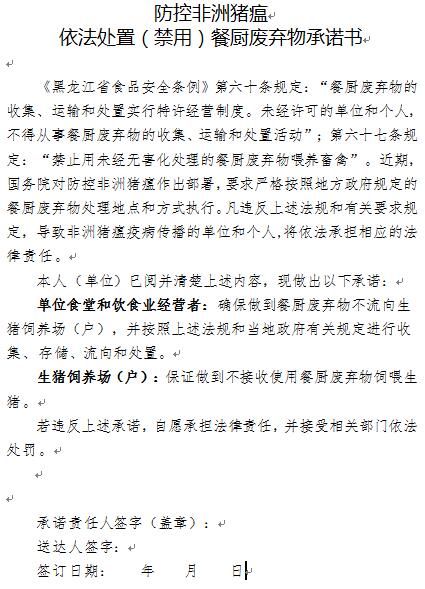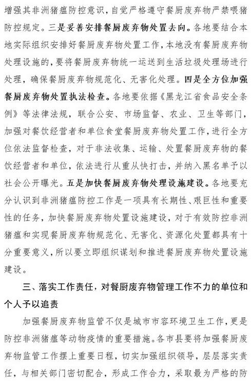 日前,黑龙江住建厅发布了关于防控非洲猪瘟加强餐厨废弃物管理工作的紧急通知,《通知》指出,目前,全国和我省非洲猪瘟防控工作形势十分严峻。国际非洲猪瘟防控实践表明,餐厨废弃物喂猪是非洲猪瘟传播的重要途径之一。各地要杜绝泔水喂猪,依据《黑龙江省食品安全条例》,建立健全餐厨废弃物监管机制,将餐饮经营者和单位食堂纳入全面监管范围,与其负责人逐一签订承诺书,并建立餐厨废弃物产生、收集、运输、处理台账,实现底数清、情况明、去向可控。全面禁止生猪饲养场(户)接收餐厨废弃物。