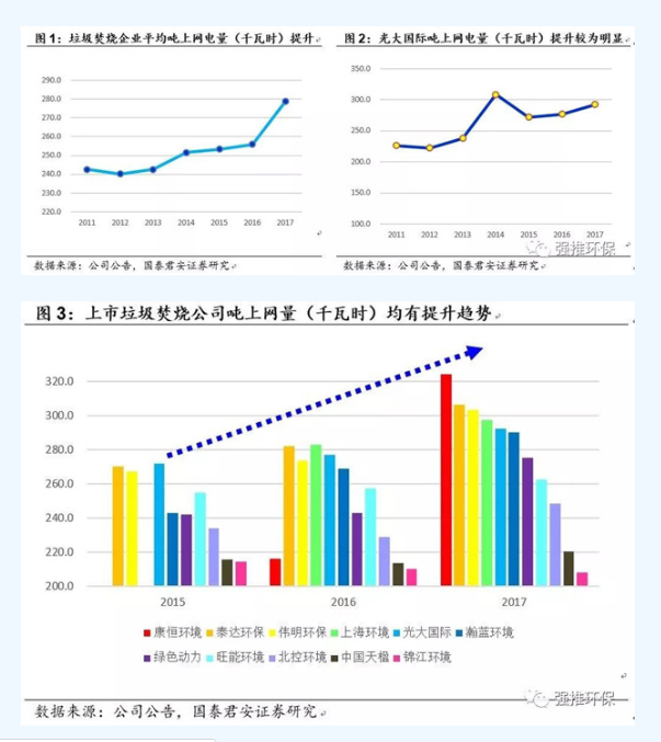 整理数据发现,近年来垃圾焚烧企业吨垃圾上网电量出现较明显的提升。 1)垃圾焚烧龙头公司的吨垃圾上网电量均值在2011-2017七年间提升36千瓦时。按照全年上网电量/年入厂垃圾量作为计算指标,2017年龙头公司平均吨上网电量均值为279千瓦时,较2011年时提升了15%,增加了36千瓦时。 2)20...