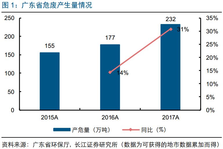 报告要点:2017年危废产量同比增31%,电子石化陶瓷产废为主。受环保督察等监管趋严的影响,省2017年产危量同比增31%至232万吨,广州深圳约占41%,肇庆(356%)/佛山(242%)/湛江(225%)/江门(212%)增速靠前。2016年广东危废占固废比例提升0.6pct至5.3%,电子行业...