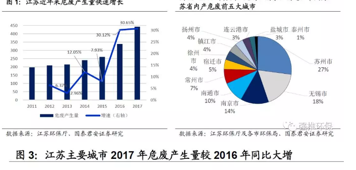 1. 省特点:增长快、转入省、供需错配1.1. 产量增长快:近两年危废产生量同比增速超过30%2015年以前,江苏省危废产生量增速约在10%左右,随着环保督查严格执法的推进,2016及2017年,年平均增速上升至30%以上。其中2017年,江苏全省危废产生量442万吨,较2016年同比增长31%。2...